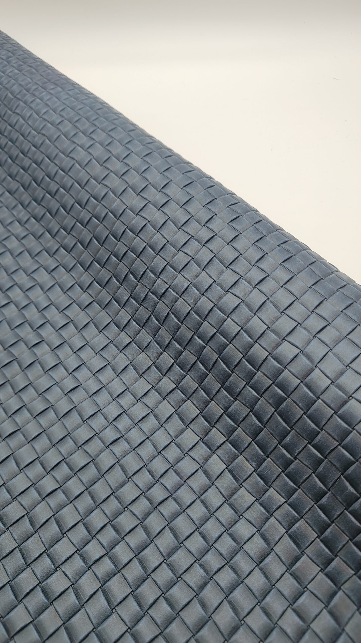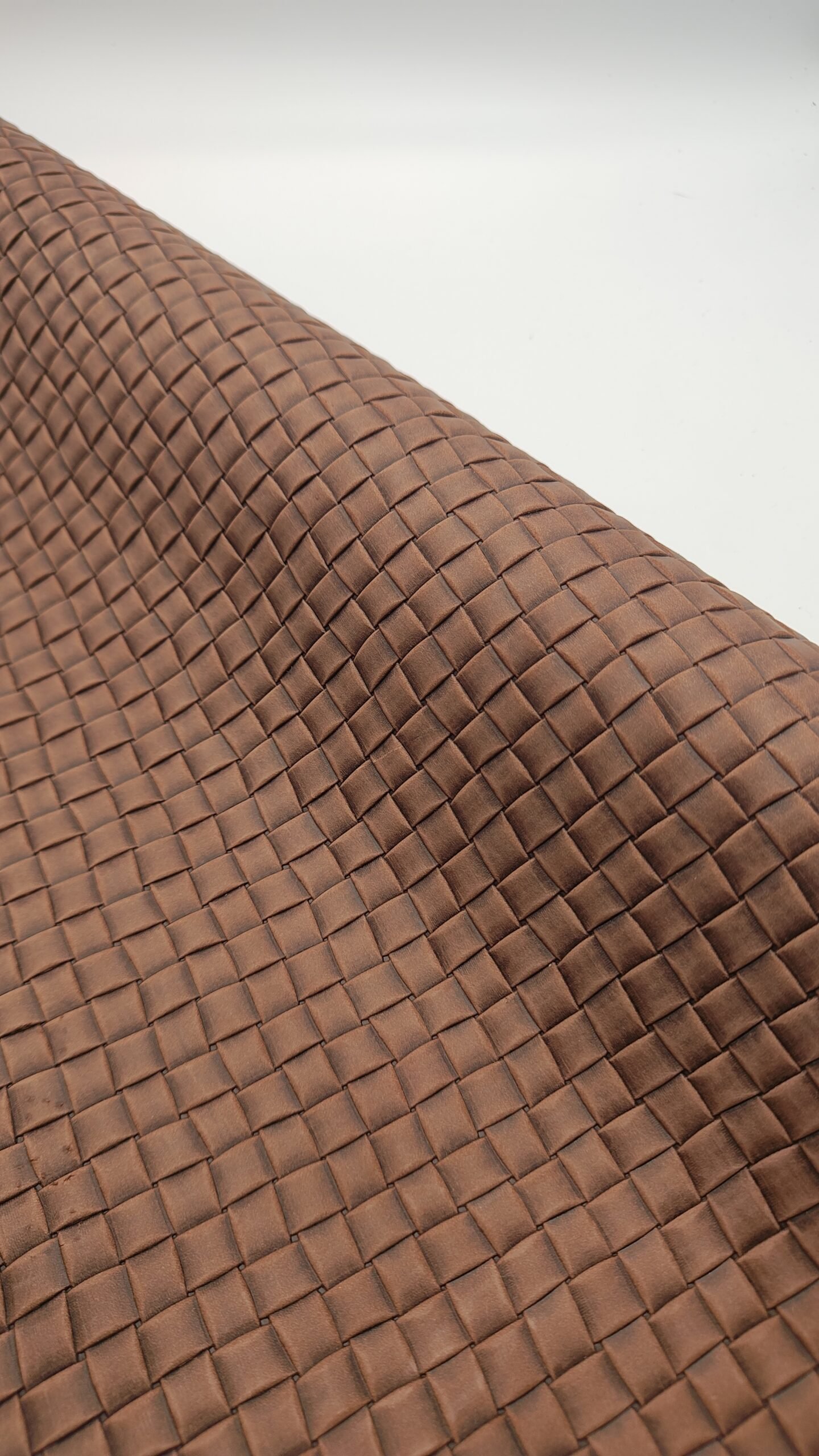 Su trama está basada en el efecto de tiras de piel que se entrelazan manualmente, generando una textura única, flexible y con gran riqueza visual.